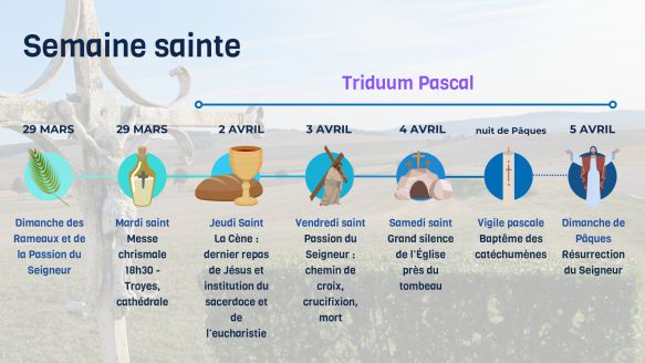 La Semaine Sainte commence le dimanche des Rameaux, inclut le Jeudi Saint et le Vendredi Saint. Elle s’achève avec la veillée pascale, pendant la nuit du Samedi Saint au dimanche de Pâques. Elle commémore les derniers jours de la vie de Jésus-Christ, sa passion, sa mort et sa résurrection.
